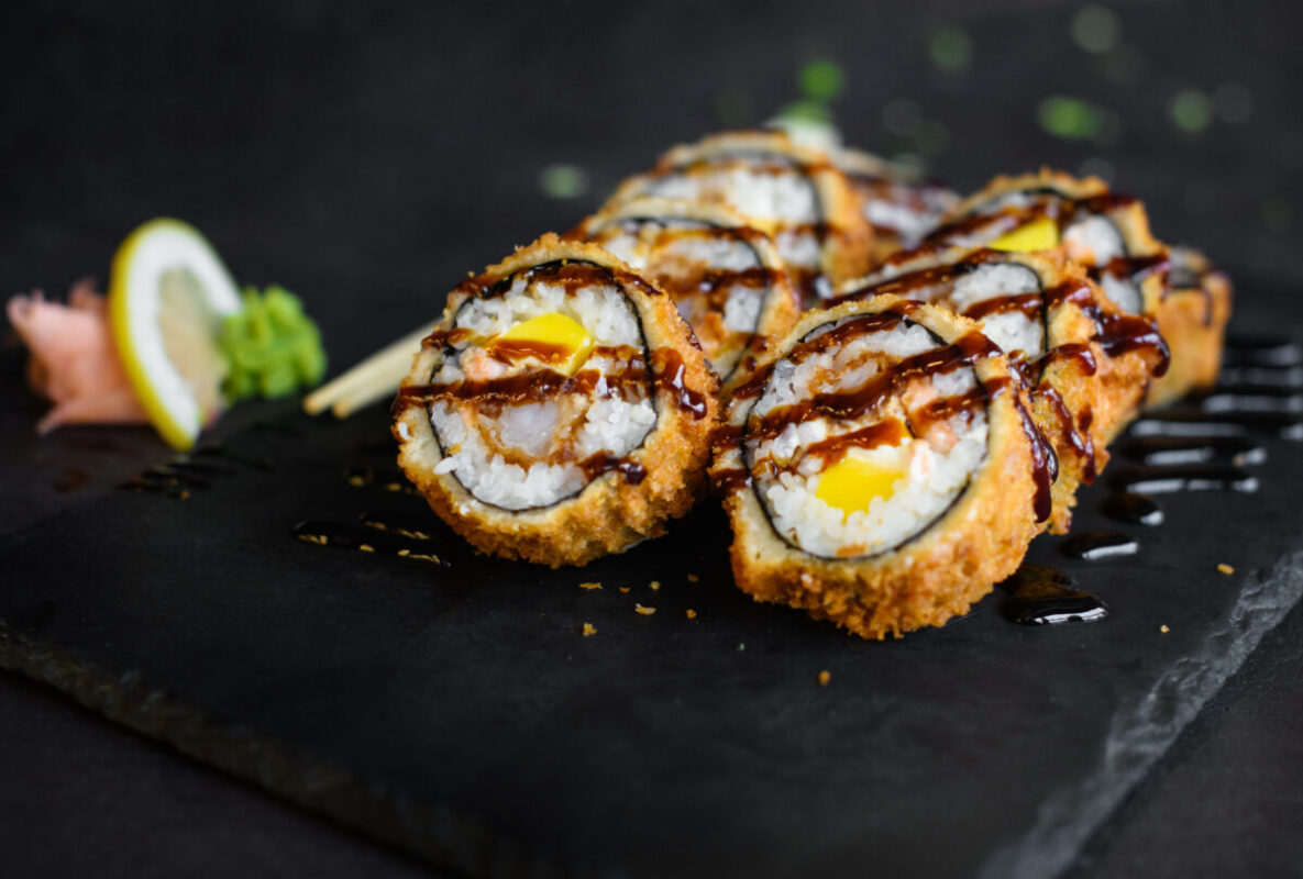 Tempuros tešloje keptos krevetės, lašiša,Philadelphia sūris, mangas, Teriyaki padažas